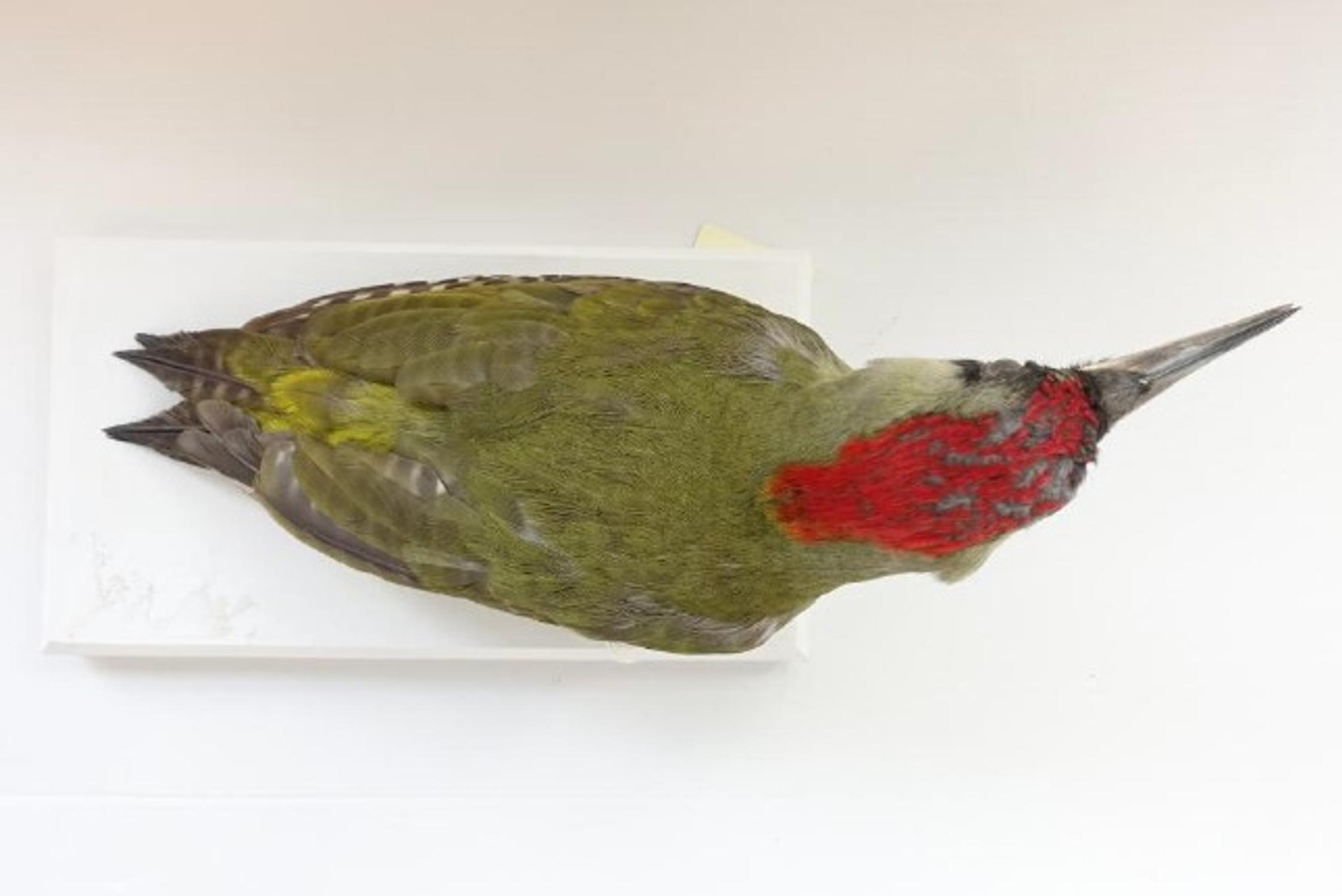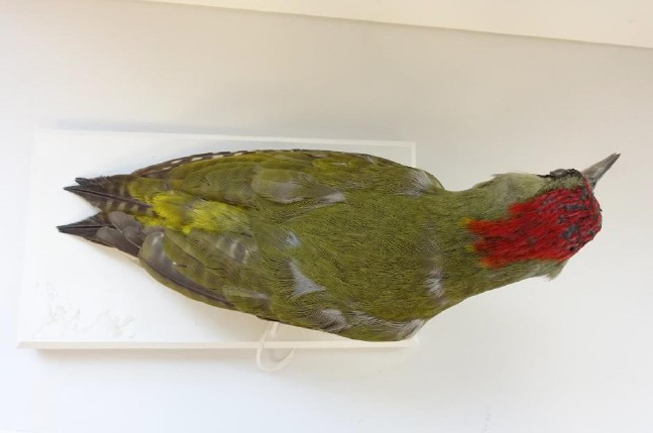Le pic-vert quant à lui est principalement utilisé lors de médiations et d'animations, vu qu'il fait partie des spécimens appartenant au matériel de prêt et de pédagogie. Même s'il n'est pas exposé en continu, ça peut arriver qu'il soit abîmé lors d'animations avec les visiteurs, à cause de trop nombreuses manipulations. Le processus reste le même, s'il s'avère trop dégradé, une campagne de restaurations est également envisageable pour ce type de spécimens.